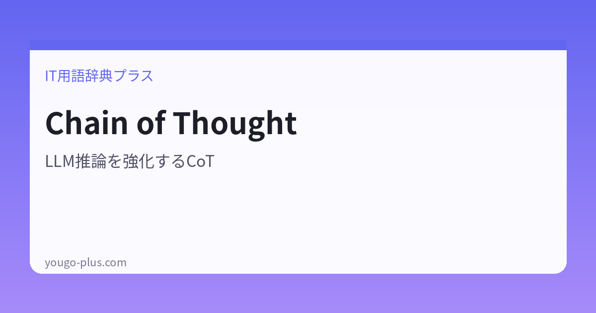 Chain of Thought(チェーンオブソート、以下CoT)とは、大規模言語モデル(LLM)に、答えを出す前に「段階的な思考プロセス」を書き出させることで、推論精度を大幅に向上させるプロンプト技法です。日本語では「思考の連鎖」「連鎖的思考プロンプト」とも訳されます。2022年にGoogleのJason Wei氏らが論文で発表して以来、LLM活用における最重要テクニックのひとつとして定着しました。